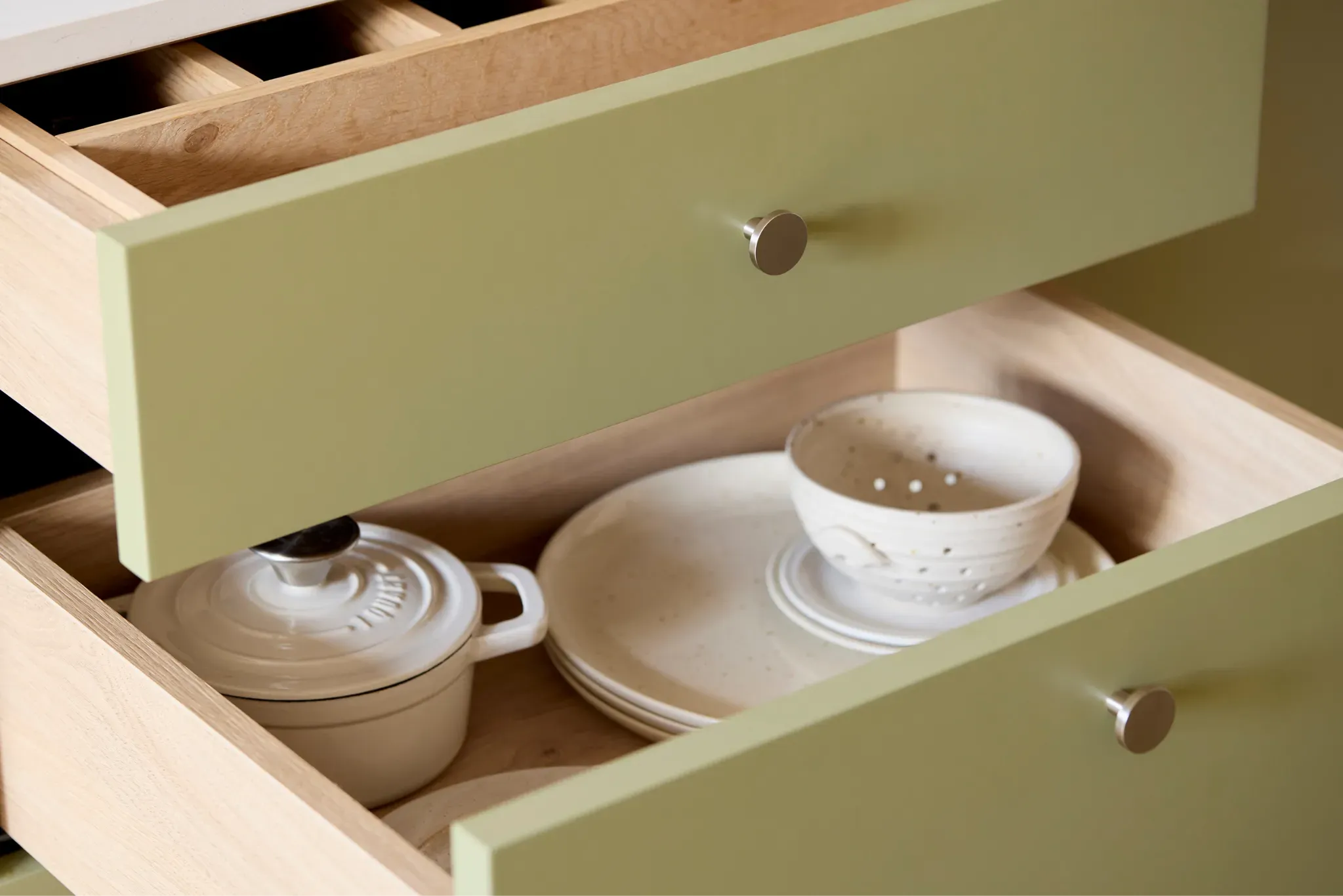 Opt for dovetailed hardwood drawers for a premium feel, or quality Howdens drawer systems for reliable day-to-day performance.