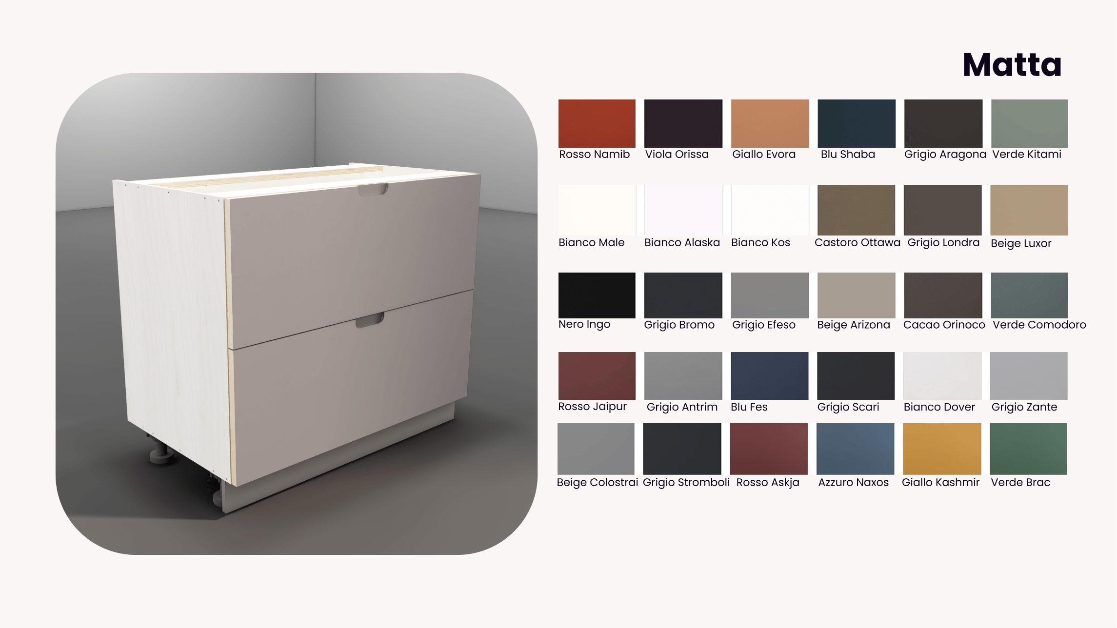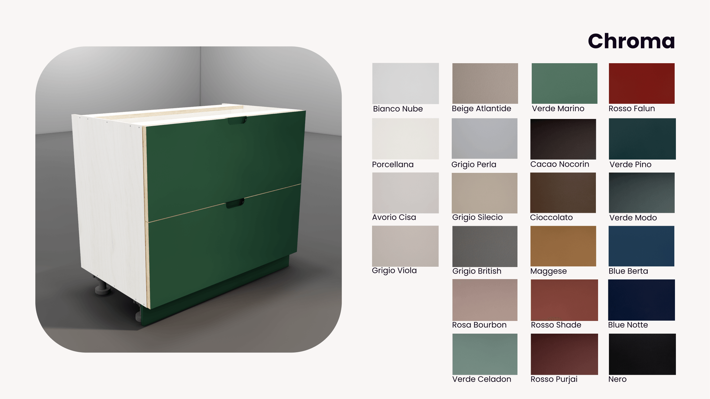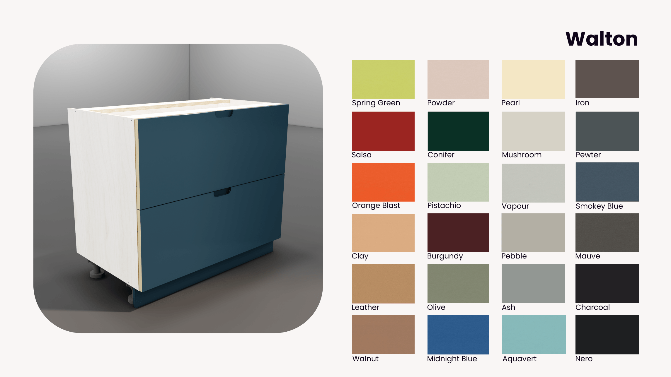 Each range comes with its own curated palette — or choose any colour you love. Our fronts can be spray-painted in our workshop for a durable, high-quality finish.