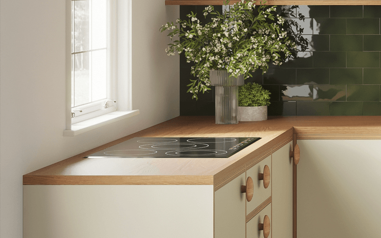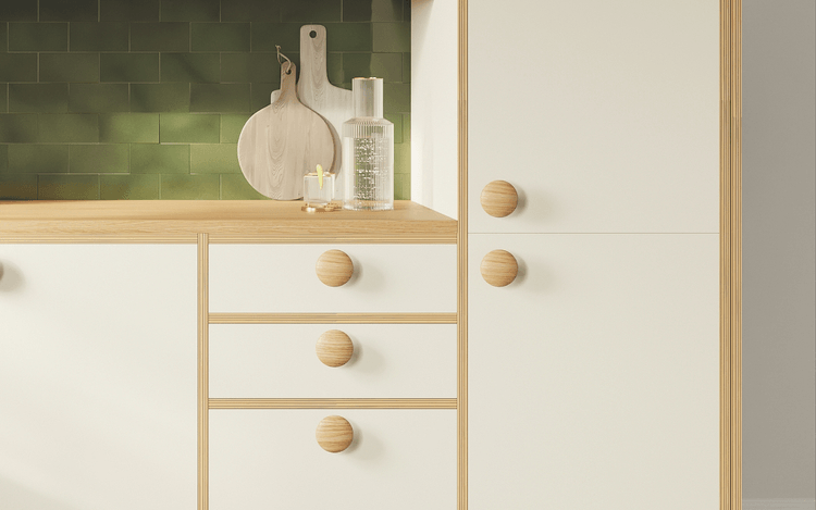 Exposed birch plywood edges, in-frame doors and sculptural oak handles bring warmth and texture to this thoughtful design. Jasper blends mid-century shapes with Victorian charm — all wrapped up in a warm, mid-contrast palette. You can personalise it with your pick of tiles and floor tones to make it feel right at home.